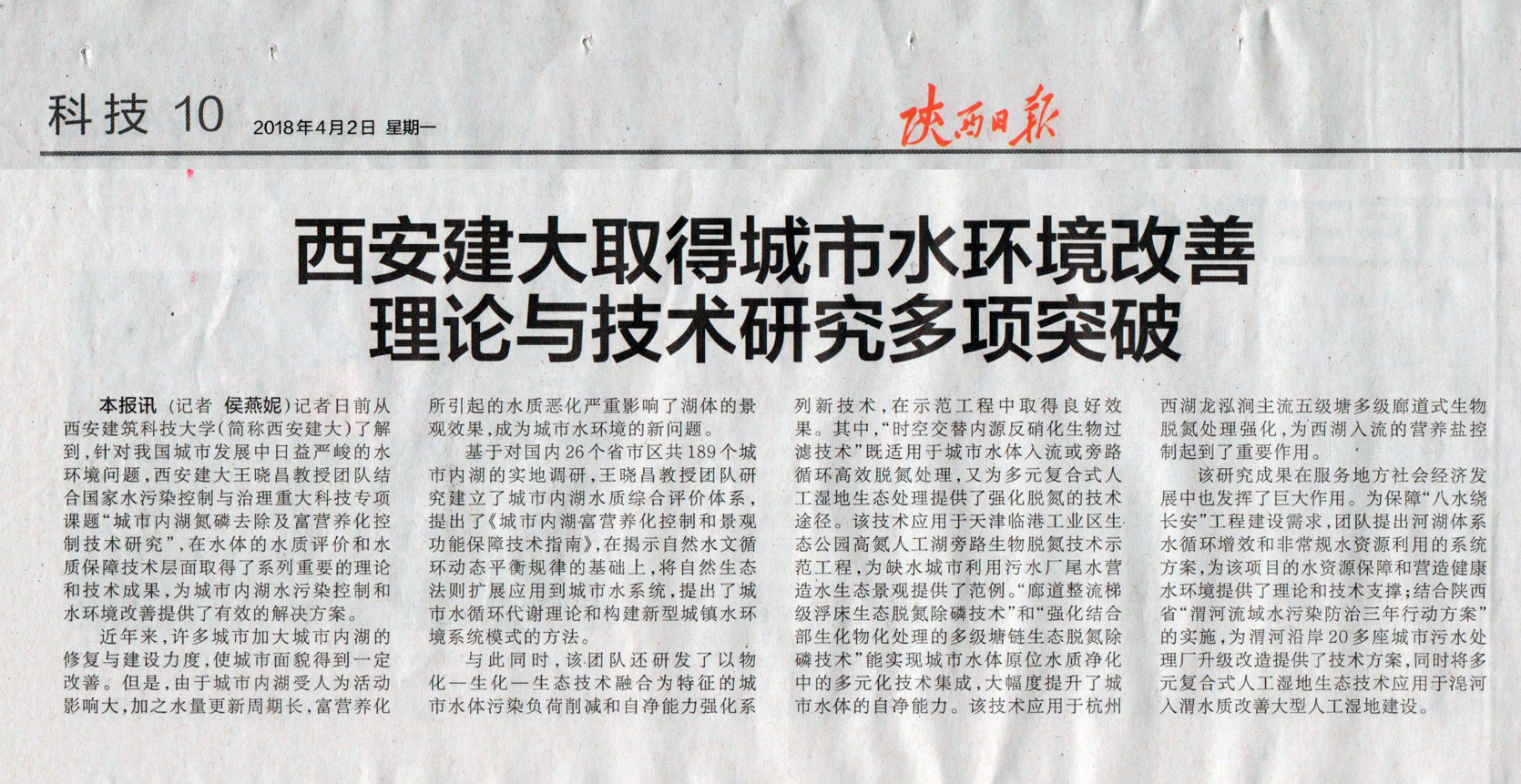 2018年4月2日,陕西日报就国合团队在城市水环境改善理论与技术研究等方面所取得的多项突破进行了专题报道,具体报道内容如下: