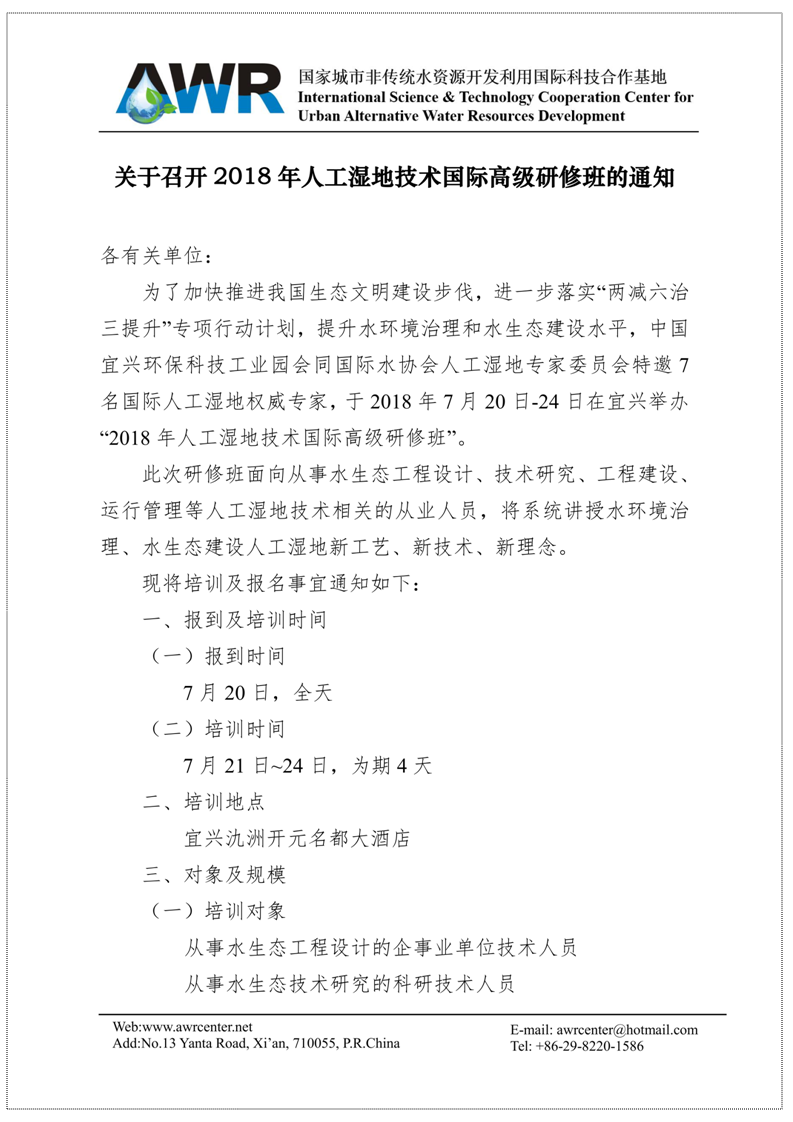 2018年人工湿地技术国际高级研修班通知