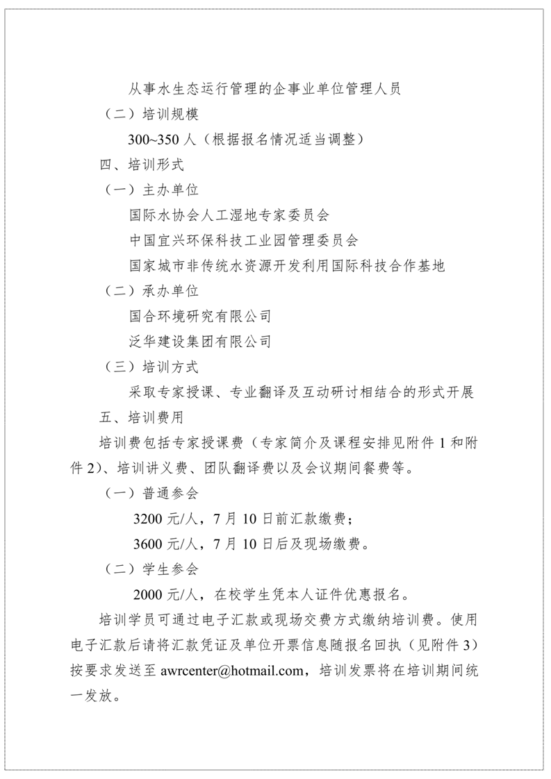 为加快我国城市水环境治理、水生态建设步伐,提升人工湿地规划设计建设水平,国合环境研究院特邀7名国际水协会人工湿地专家委员会权威专家,于2018年7月20日-24日在宜兴举办“人工湿地技术国际高级研修班”, 具体信息详见下方通知: