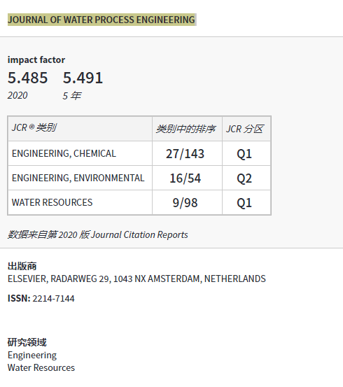 据科睿唯安最新发布的2020年度JCR 期刊引证报告,我校王晓昌教授担任共同主编的Elsevier期刊—Journal of Water Process Engineering(JWPE)影响因子升高到5.485,在98种水资源类期刊中位列第9位,进入JCR Q1区;在143种工程化学类期刊中位列第27位,也进入JCR Q1区;在54种环境工程类期刊中位列第16位,仍为JCR Q2区。